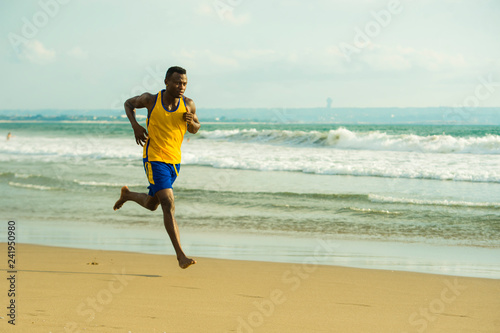 young attractive fit athletic and strong black African American man running at the beach training hard and sprinting on sea water in professional athlete lifestyle