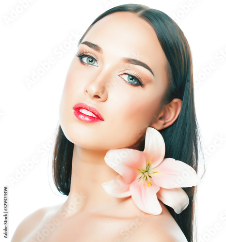 young attractive lady close up with hands on face isolated flower lily brunette spa nude makeup macro