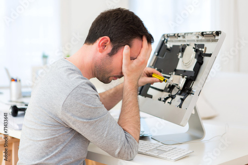 man, repairing, computer, 30s, fail, problem, issue, computer specialist, engineer, part, computing, hard disk drive, card, memory, screen, solve, mender