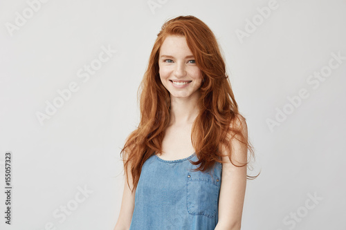 Young attractive redhead girl smiling looking at camera.