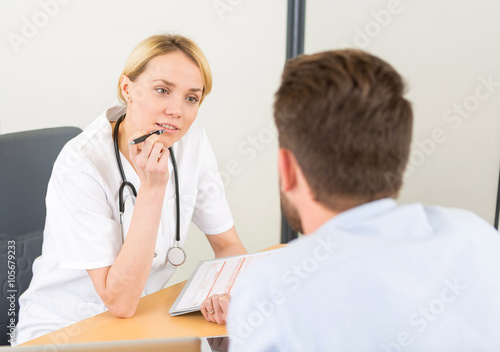 doctor, woman, patient, writs, note, paper, talking, tablet, man, blond, attractive, 40s, people, stethoscope, surgeon, office, exam, laptop, health, desk