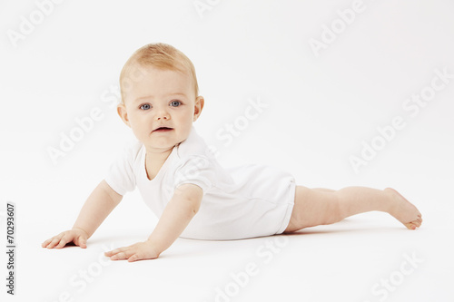 one person, baby, caucasian appearance, studio shot, white background, indoor, blond, blonde hair, short hair, white, wearing, new life, innocence, female, full-length, barefoot beach, half face, portrait, eye contact, crawling, blue eye, color image, photo, horizontal, content, childhood