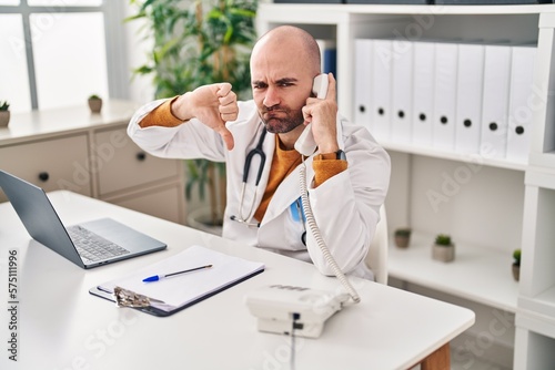 Young bald man with beard working on telephone appointment with angry face, negative sign showing dislike with thumbs down, rejection concept