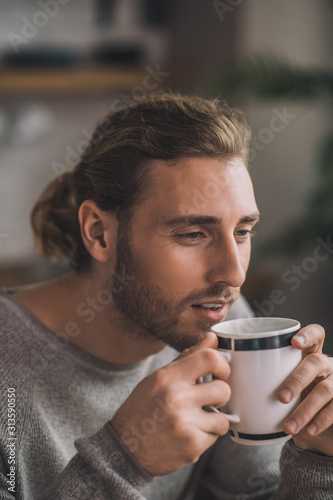 man, young adult, photogenic, bearded, young men, caucasian, home, loft, apartment, indoor, domestic life, comfortable, home, weekend, grey shirt, morning, long-haired, alone, one person, day off, thinking, thoughtful, resting, relaxed, sitting, hot drink, cup, coffee cup, good-looking