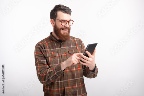 Young bearded hipster wearing glasses is using his tablet on white bakcground.