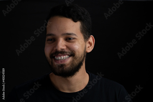 portrait, face, young, photogenic, black, guy, person, casual attire, people, eye, expression, dark, looking, model, happy, confident, smile, beard, studio, satisfied, good news, goodtime, happiness, cheerful, big smile, smiling, adult, young men, male, head shot, 20s, man, fashion, cool, black background, latin, 1, style, caucasian, background