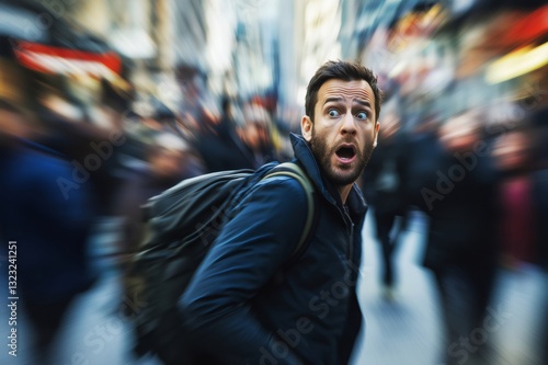 man, crowd, street, walking, surprised, shock, fear, anxiety, blur, motion, city, travel, tour tourism, looking, turning, backpack, beard, young, urban, people, commuting, hurry, fast, movement, expression, emotion, worried, danger, stress, amazed, startled, rush, metropolitan