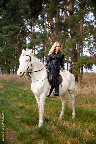 young beautiful blond smiling woman with long hair in black dress riding a white horse with blue eyes in autumn field