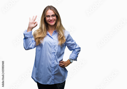 Young beautiful blonde business woman wearing glasses over isolated background smiling positive doing ok sign with hand and fingers. Successful expression.