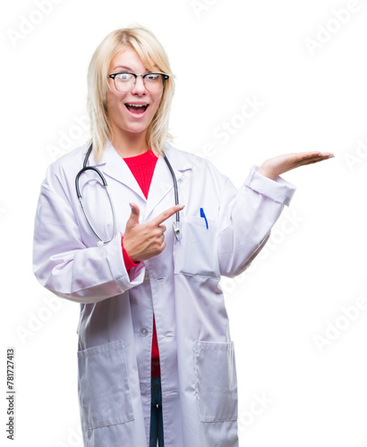 Young beautiful blonde doctor woman wearing medical uniform over isolated background amazed and smiling to the camera while presenting with hand and pointing with finger.