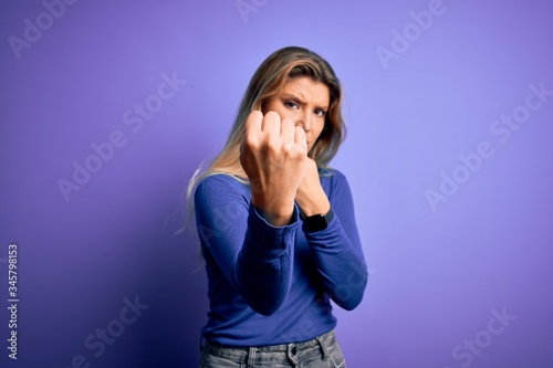 Young beautiful blonde woman wearing casual t-shirt over isolated purple background Ready to fight with fist defense gesture, angry and upset face, afraid of problem