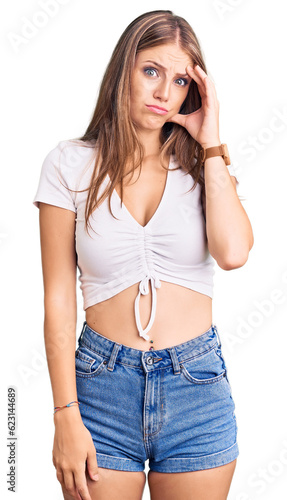 Young beautiful blonde woman wearing casual white tshirt worried and stressed about a problem with hand on forehead, nervous and anxious for crisis