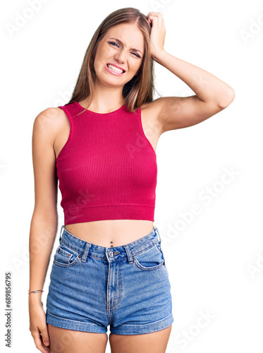 Young beautiful blonde woman wearing elegant summer shirt confuse and wonder about question. uncertain with doubt, thinking with hand on head. pensive concept.