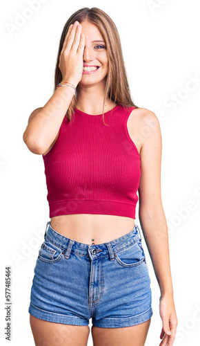 Young beautiful blonde woman wearing elegant summer shirt covering one eye with hand, confident smile on face and surprise emotion.