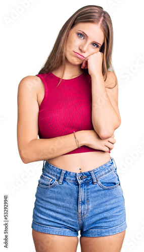 Young beautiful blonde woman wearing elegant summer shirt thinking looking tired and bored with depression problems with crossed arms.