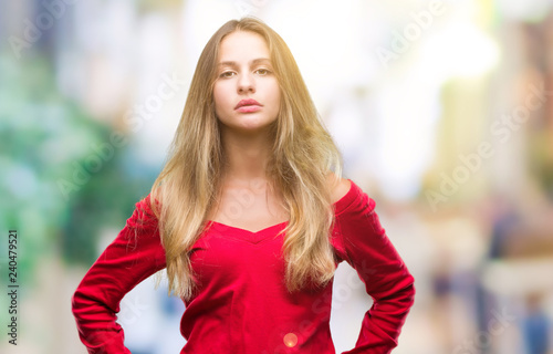 Young beautiful blonde woman wearing red sweater over isolated background with serious expression on face. Simple and natural looking at the camera.