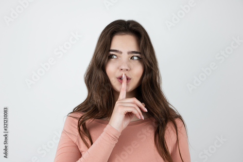 young beautiful brunette woman holding her finger near her lips showing silence sign standing on isolated white background