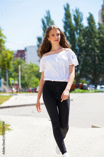 Young beautiful brunette woman in jeans and white blouse walking in summer street