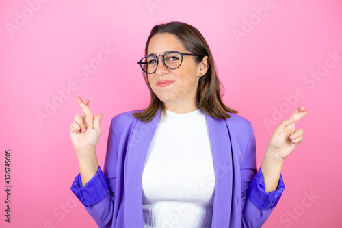 Young beautiful business woman over isolated pink background gesturing finger crossed smiling with hope
