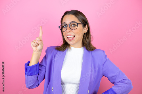 Young beautiful business woman over isolated pink background surprised and thinking with her finger on her head that she has an idea.