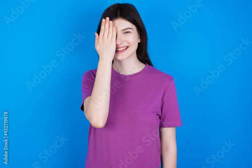 young beautiful Caucasian woman wearing purple T-shirt over blue wall covering one eye with her hand, confident smile on face and surprise emotion.
