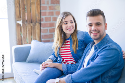 Young beautiful couple sitting hugging in love on the sofa at home