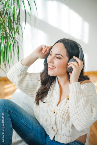 Young beautiful dark-haired curly woman in a knitted cardigan listens to music on headphones while sitting in an armchair in a cozy home. Rest.