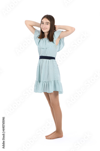 Young beautiful girl in a dress with polka dots on a white background.