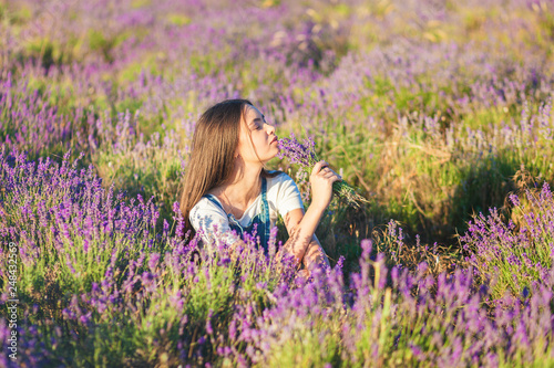 Young beautiful girl sits on a lavender meadow with a bouquet of flowers in their hands