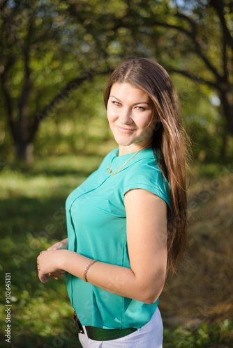 Young beautiful happy business woman in green shirt outdoors