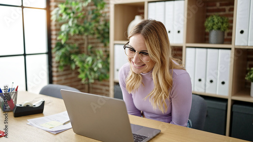 young, hispanic, woman, female, person, portrait, adult, beautiful, blond, latin, happy, confident, confidence, smile, positive, joy, smiling, business, professional, work, men at work, working, success, manager, boss, employee, elegant, job, table, desk, executive, computer, laptop, cyberspace, online, goggles, office, workplace, indoor, indoor, interior, room, background