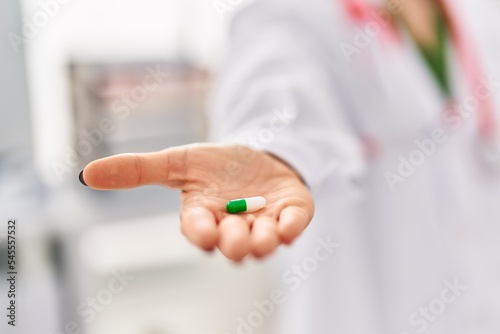 young, hispanic, woman, female, person, portrait, adult, beautiful, short hair, doctor, health care, medicals, medicine, working, professional, stethoscope, uniform, table, diagnosis, visit, consultation, goggles, pill, drug, pharmaceutical, treatment, standing, racked, taking, capsule, holding, pill, drug, clinic, center, hospital, room, workplace, indoor, indoor, interior, background