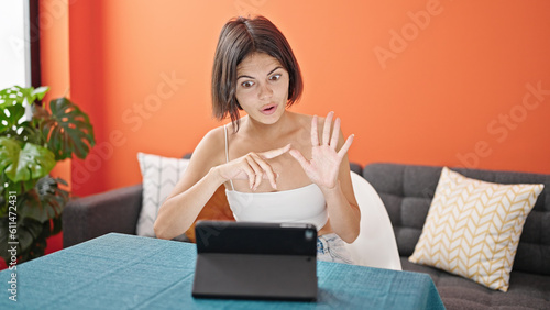 Young beautiful hispanic woman having online lesson counting fingers at dinning room