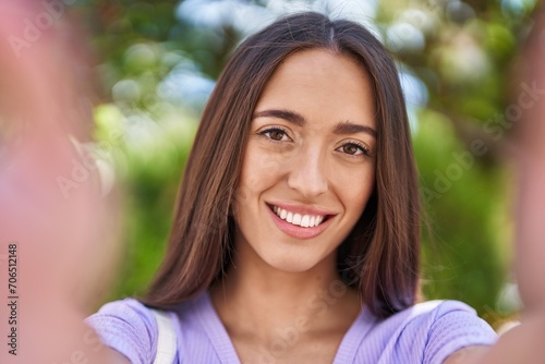 Young beautiful hispanic woman smiling confident making selfie by camera at park