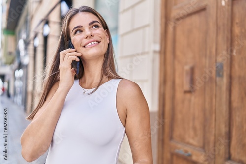 Young beautiful hispanic woman smiling confident talking on the smartphone at street