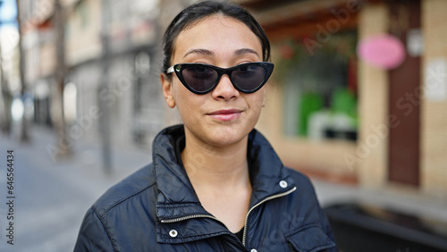 Young beautiful hispanic woman standing with serious expression wearing sunglasses at street