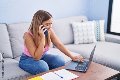 Young beautiful hispanic woman student sitting on sofa talking on smartphone at home