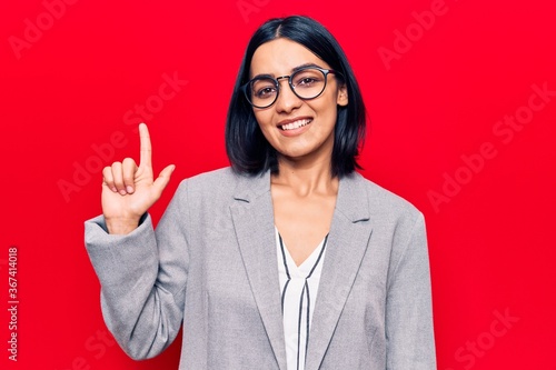Young beautiful latin woman wearing business clothes smiling with an idea or question pointing finger up with happy face, number one
