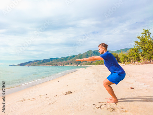 Young beautiful man doing sport performing workouts exercises near sea in the morning during quarantine. Active life without surgical sterilizing face mask protection