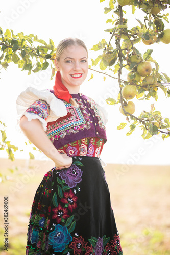 Young beautiful slovak woman in traditional costume. Slovak folklore.