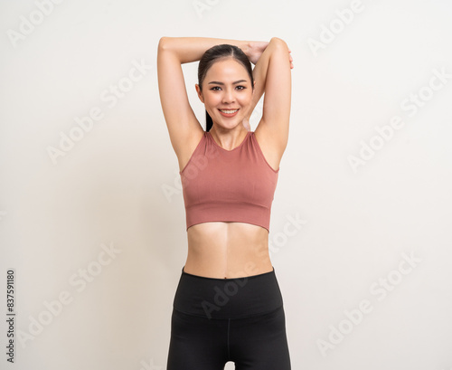 Young beautiful smiling asian woman with sportswear stretching arm warming up before training. Happy healthy slim fit and firm latin attractive sporty woman standing pose exercise workout in studio.