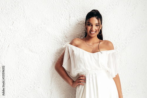 Young beautiful smiling female in trendy summer dress clothes. Sexy carefree woman posing near white wall in studio. Positive model having fun and going crazy. Cheerful and happy