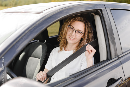 young beautiful smiling woman sitting in motionless car looking straight to camera, fastening her seatbelt, attractive caucasian woman in white t-shirt
