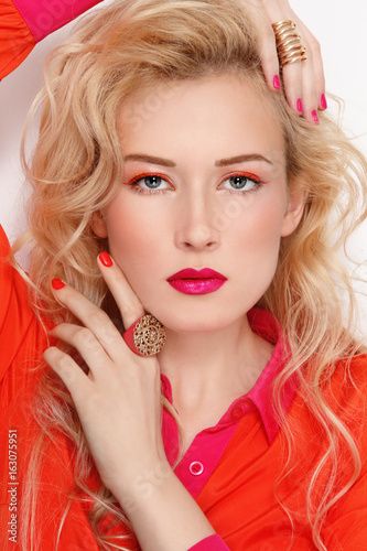 Young beautiful stylish blond woman with fancy bright make-up and manicure
