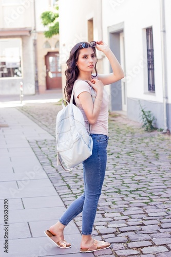Young beautiful woman brunette walks at the city in Europe. Summer. Happy girl. Street fashion.