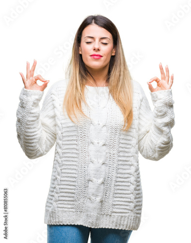 Young beautiful woman casual white sweater over isolated background relax and smiling with eyes closed doing meditation gesture with fingers. Yoga concept.