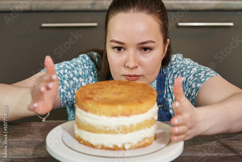 young beautiful woman in the kitchen collects a round-shaped cake. creating a birthday cake.
