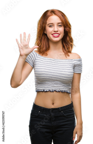 young, woman, girl, teenage, redhead, adult, portrait, beautiful, isolated, background, excited, yes, success, happy, joy, expression, model, honed, fashion, cool, number, 5, finger, 5, hand, person, signs, gesture, people, pointing, up, idea, showing, concept, smile, cheerful, symbol, counting, communication, fifth, smiling, positive, raising, point, confident, natural