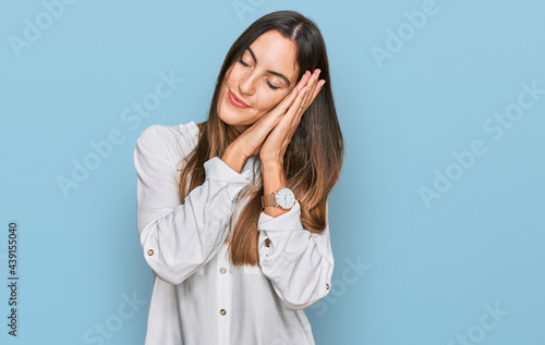 Young beautiful woman wearing casual clothes sleeping tired dreaming and posing with hands together while smiling with closed eyes.