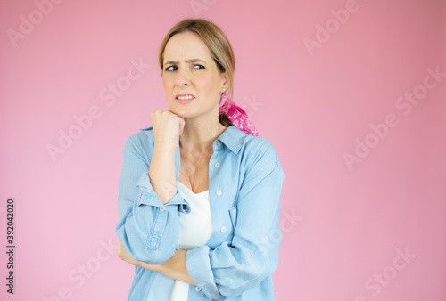 Young beautiful woman wearing denim shirt over pink isolated background Thinking worried about a question, concerned and nervous with hand on chin
